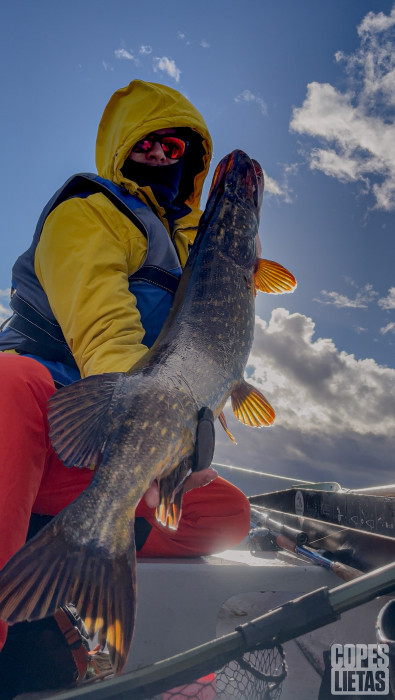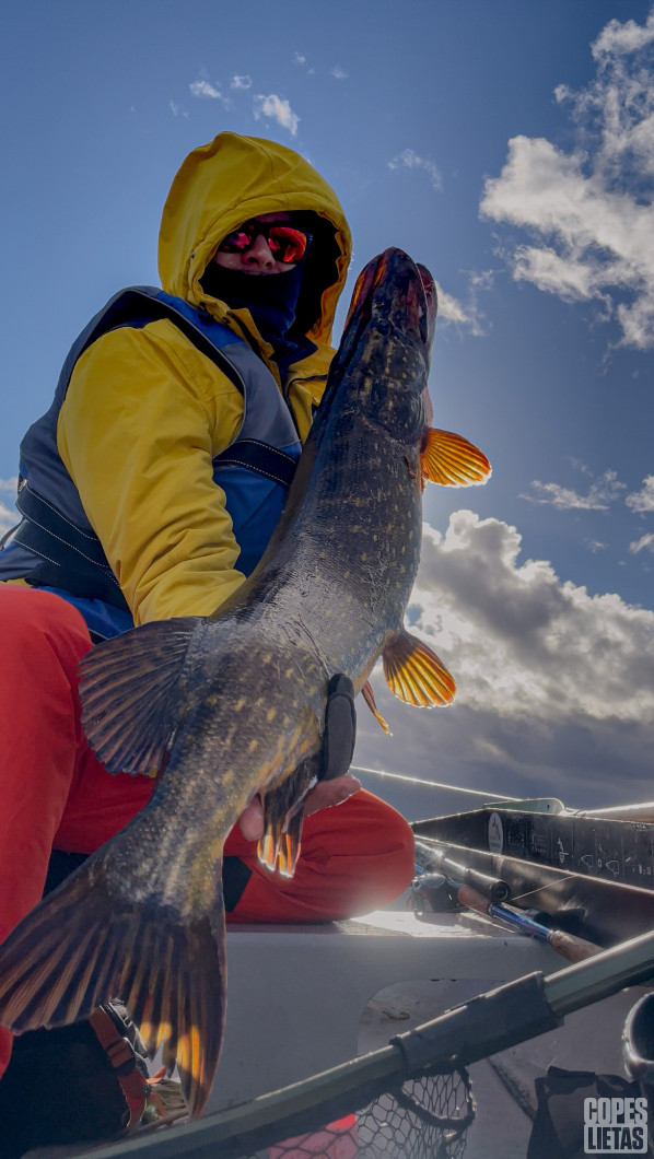 Šodien no 8:00-14:00, ezerā pilnīgi viens, nevienu laivu neredzēju, vien atpakaļ braucot pie niedru lauka spuņupē. Es uztaisīju 5 nolaidienus pāri visam ezeram, no ziemeļu krasta līdz dienvidu krastam. Pie šādiem vējiem sapratu, ka jāapdomā kārtīgāk enkuru jautājums, ar “stock” enkuru/bremžu disku + 1.2m parašūtu, mani pūta ~4km/h. Ūdens ezerā šodien bija arī tur kur tas nekad nav bijis, vismaz šogad. :D Man par pārsteigumu, tik fiziski nogurdinošā dienā, zivs bija pat teiktu ļoti piekritīga. 3 nerealizētas, 1 paņēma pie pašas laivas, šķiet 60-70 bija, bet atteicās bildēties. Pēc 200 metriem pieteicās nākamā, šoreiz tālāk no laivas, 60cm. Otrajā nolaidienā, pēc Dāvja ieteikuma eksperimentēt, sāku taisīt stop-go ar ~4sek pauzēm starpā un pēkšņi jūtu, 1reiz grābj, 2reiz un ir. Mazs dancis ar lēcienu un 102 ir laivā. Gator mirage un tatula iesvētīti ar metru, pilnīgi prieks. Viens gan mīnuss multiem, pietrūkst bremzes tirkšķis. :( Šodien viss bija līdzi, bet citus kātus rokās nemaz nepaņēmu, tikai BB. Tāpat, sevi bildēt un lavierēt ar to krokodilu ir elles darbs. :D Abas zivis peld tālāk.