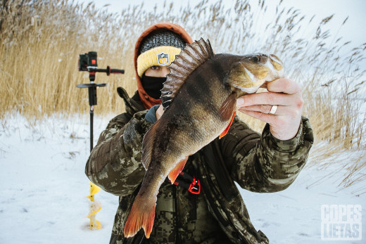 Nu ko, neskatoties uz meteorologu brīdinājumu par vēja ātrumu līča piekrastē līdz 20 m/s, nenocietos un aizlaidu uz copi 😁 Jutu, ka zivīm šādi laikapstākļi arī nepatiks, neskatoties uz to, ka tās no vēja droši sargā salīdzinoši bieza ledus kārta, tomēr, paskatoties kalendārā sapratu, ja šodien neizraušos uz copi, nākamreiz tikšu tikai pēc nedēļas. Sacīts darīts, no paša rīta esmu pie ezera, vējš jau jūtami pūš, satuntelējos biezākās drēbēs un aidā pēc pirmās 2026. gada copes sezonas zivteles! 😃 Vējš uz ezera tik stiprs, ka uzkāpjot uz plika ledus, mani pūta prom kā hokeja ripu, tādēļ, ja neuzsnigs tuvākajās dienās sniegs, ērtai kustībai pa šādu virsmu labāk izmantot apaviem uzveklamos dzelkšņus, kurus Oskars, protams, atstāja mājās 😁 Smalkais sniegs virpuļoja un stipri sita pa acu zīlītēm, pat stāvot ar muguru pret vēju. Pilnīgi prasījās pēc slēpotāju brillēm. Uzreiz jāatvainojas Mārupes novada pašvaldības darbiniekiem, jo pavisam nedaudz pārkāpu saistošos noteikumus - ledus biezums pašlaik ezerā ir 13 cm robežās, bet atļauts uz tā atrasties sākot no 15 cm. Cerams man tiks piedots, jo ledus patiešām drošs, sniega uz ezera praktiski nav un ārā temperatūra no rīta bija ap -11 grādiem, tā ka pēc pāris dienām tiks sasniegti tie paši noteiktie 15 cm. Īsumā par copi - jau vakar zināju, ja zivs būs pasīva, copēšu ne ilgāk kā līdz pusdienlaikam. Tā arī notika, pēc 11:00 devos krastā, jo pa šīm pāris stundām bija tikai 1 cope. Bet kāda! Svītrainais razbainieks ieblieza pa kātu nepajokam un balansieris pilnībā pazuda asara platajā mutē! :)) Pēc šīs vienīgās zivteles noķeršanas, apsveicu sevi ar 2026. gada pirmo lomu, tāpat arī tā ir šīs ziemas sezonas pirmā zivs. Priekš pirmā svītraiņa nav nemaz tik slikti, veseli 38+ cm garš un 850 g smags. Nu tad novēlu visiem foršu nedēļas nogali, sagaidiet brāzmainā vēja pierimšanu un aidā pie dabas baudīt smuko ziemas iestāšanos! ;)