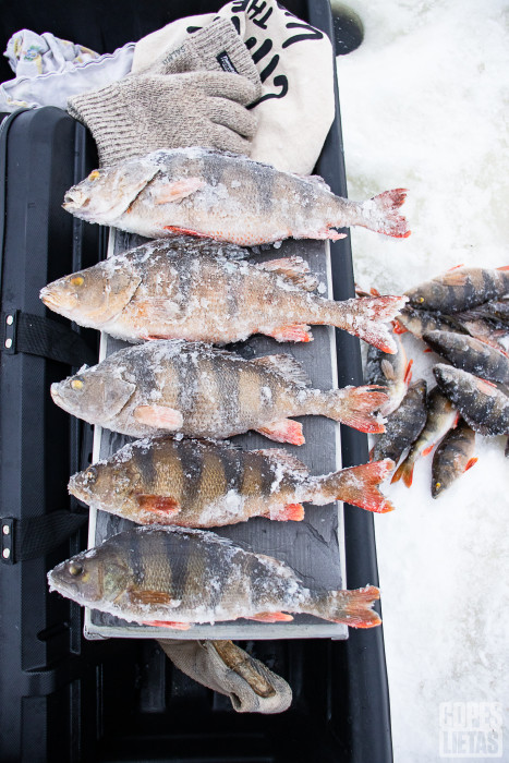 Kārtējo reizi brīvdiena "iekrita" nu dikti aukstā dienā. Piebraucu pie ezera, termometrs mašīnā rādīja -15,5 grādus. Ja vēl būtu bezvējš, bet kas tev deva, vidēji stiprs vējelis tomēr pūta. Sapratu, ka šancēšu tikai cimdos un ne ar tiem mazākajiem mānekļiem, jo bez cimdiem šādā laikā copējot, pirkstiem ātri vien pienāks cauri balle! :)) Ātri atradu zivtiņas, pirmais strīpainis uzreiz tīris smuks - 450 grami, tad kāds biku mazāks, tad sērija ar nopūdelētām zivīm un es pie sevis nodomāju, ka nākamo cirtīšu tā no sirds un forsēšu ārā. Un kā par spīti, tieši nākamā zivs pēc sajūtām bija asaris ap kilo+, jo salīdzinot ar 450-nieku, tas turējās pretī dikti brangi - kāts ripā, aukla nospriegota. Tikko es padomāju, ka biku šim jāpadod aukla, lai nepārplēš, tā tieši šajā brīdī mans zemūdens traktors kopā ar zivīgu mānekli (roku darbs, kas man bija vienā eksemplārā), aprauj auklu un aidā prom... Eh, škrobe gan šai brīdī man bij` liela, bet neko darīt. Šogad lielie asari, pagaidām, mani vinnē :D Pēc laika tieku vēl pie viena smuka strīpaiņa (600g), bet pārējie vairāk cepama izmēra asari. Tomēr neskatoties uz trefejzivs nopūdelēšanu, kopumā diena izdevās, jo sajutu aptuveni 30+ sitienus pa kātu, no kuriem realizētas tika 20+ copes. Visiem vieglu darba nedēļu, tiekamies uz ezera vai arī šļūcot no kalna, jo laiciņš joprojām dikti ziemīgs! ;)
