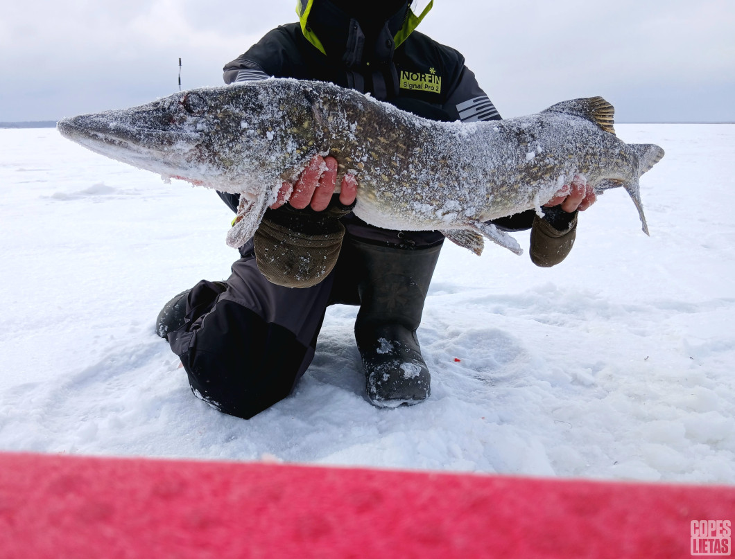 Bilde tāda neveikla. Nu nekas, vismaz linčotāji pakārt nevarēs. Un ar ko viss sākās. Viss sākās ar asaru medībām Babītes ezerā. Ārā -15 un viegls vējiņš. Urbis 110 mm, asaris jāmeklē un jāsildās urbjot. Trešajā caurumā jau smuka cope un smuka zivs, bet tā aizlaižas lapās. Vismaz iedot kārtīgu motivāciju darboties. Tieku pie trim asarēniem, kurus ielaižu spainītī. Dodos uz vietiņu, kur pirms dažām dienām tiku pie sava lielākā babes asara, netālu no krasta, seklumiņš tur labi ja pusmetrs. Saurbjos krustu šķērsu , visur pārsvarā zāle apakšā. Asaris necopē. Jāuzliek vismaz uz dzīvo, jāpakustas, jāpadarbojas, jāsasildas. Varbūt kāds uz vakariņām pieteiksies. Ārā riktīga ziema, labi, ka siltas brokastis līdzi. Tā nu copējot paceļu acis uz karodziņu, un tirkš…uzsit un paceļas, un klusums. Pieeju paskatos kas un kā-nekā. Tikai uzsita. Ielaižu atpakaļ. Nu laiks, arī man uzēst. Kožu tostermaizē un atkal tirkš…šoreiz kaut kas kustina, pieeju, jā, aukliņa kustas un uztirkšķ. Jāpiecērt, nav ko marinēt. Ir. Nu i labi, mēra zivs, nekur tālu viņa nav,bet jūtu , ka nav tik viegli caurumā dabūt. Lūkojos iekšā, caur vižņiem liekas , nevar saprast, bet iekšā nelien. Novelku cimdu, patīru ledu, skatos āķis lūpu kaktiņā un smukums liels. Klasiskā izvilkšana neies krastā, tas pat nav iespējams. Tākā uz līdaku baigo akcentu nelieku, kā būs tā būs, vienmēr var viņas atlaist, ja pareizie instrumenti un maigas rokas. Neko darīt. Jābāž roka āliņģī. Jāmēģina satvert aiz purniņa vai žaunas vai acīm un tad jāiebīda caurumā. Reāli nereāli. Ar kādu trešo, ceturto reizi, atlaižot un pievelkot izdodas zem zoda pie G punkta iebāzt pirkstņu, tagad tik jāpaceļ. Un ir ar. Deguntiņš ārā. Velku, velku un atkal velku, ar vien lielāku un garāku izstiepju, līdz beidzot metrs uz ledussniega guļ. Nesaprotu kas un kā, ko darīt. Atpakaļ jau neiebāzīs, tas būtu smieklīgi. Pirkstiņš tomēr viens kā pie asins analīzēm durts, smuki tek, bet nieki vien. Nu tad ātri pāris bildes un balle beigta. Kaut gan zemapziņā vienmēr gribējies vienu zivi izvilkt dēla augumā. Nu tagad miers mājā. Un sanāks gan sev, gan radu gabalam pa gabalam. Un zivs galva vasarā saulē lūkosies un gaidīs pirmo lakas kārtu, atgādinot par kādreiz piedzīvoto, sajusto, izgaršoto un copmanim tik sev zināmo impulsu, adrenalīnu, par veiksmīgām dienām meklējot copi kaut kur, kaut kad.