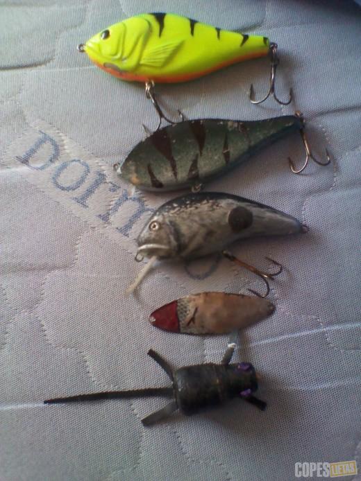 Vidū ir tas slavenais neitrālas grimšanas vobleris kurš ar šo īpašo parādību man dikti patīk. Nebija domāts viņu dabūt tā,ka viņš ūdenī ieņem neitrālu pozu kad apstājas...interesants :) melnais pleķis ir špaktele kura nosed grabuli,tur iekšā ir vesels grabulis apaļais,kuri tiek izmantoti gruntenēm kā signalizatori. Virs viņa atrodas otrs rokdarbs,tiesa ne tik veiksmīgs,viņš ir jāuzlabo,citādi raustot brīžiem iet uz sāniem brīžiem iet kā bulta =)