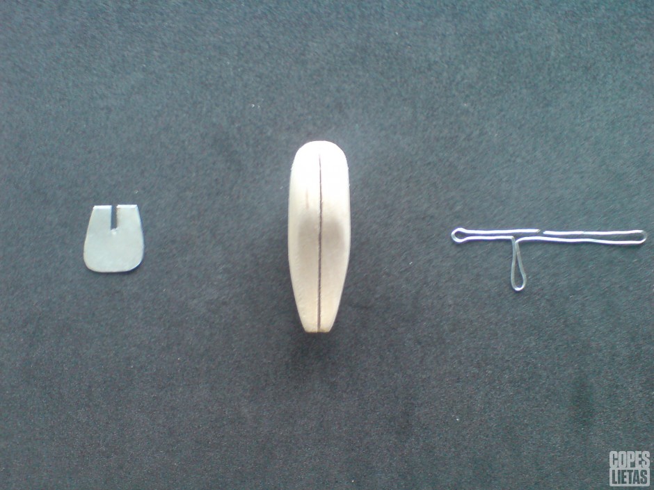 Voblera rokdarbi pusceļā! Ķermenis jau izgriezts, ievietojam stieplīti un mēlīti! Mēlīte bildē ir mazliet greiza, bet pēc tam tika pieslīpēta! Metāla mēlītes pluss ir tas, ka pēc tam to var pielocīt, mainot gan ieniršanas dziļumu, gan voblera spēli!