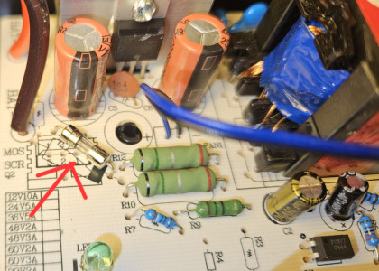 Oriģinālais lādētājs. Par laimi nostrādāja “aizsardzība pret muļķi” — nosvila drošinātājs. Kā to ķibeli atrisināju: diemžēl neatradu oriģinālo T15A250V drošinātāju, ielodēju F15A250V.