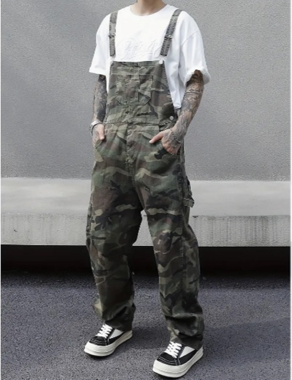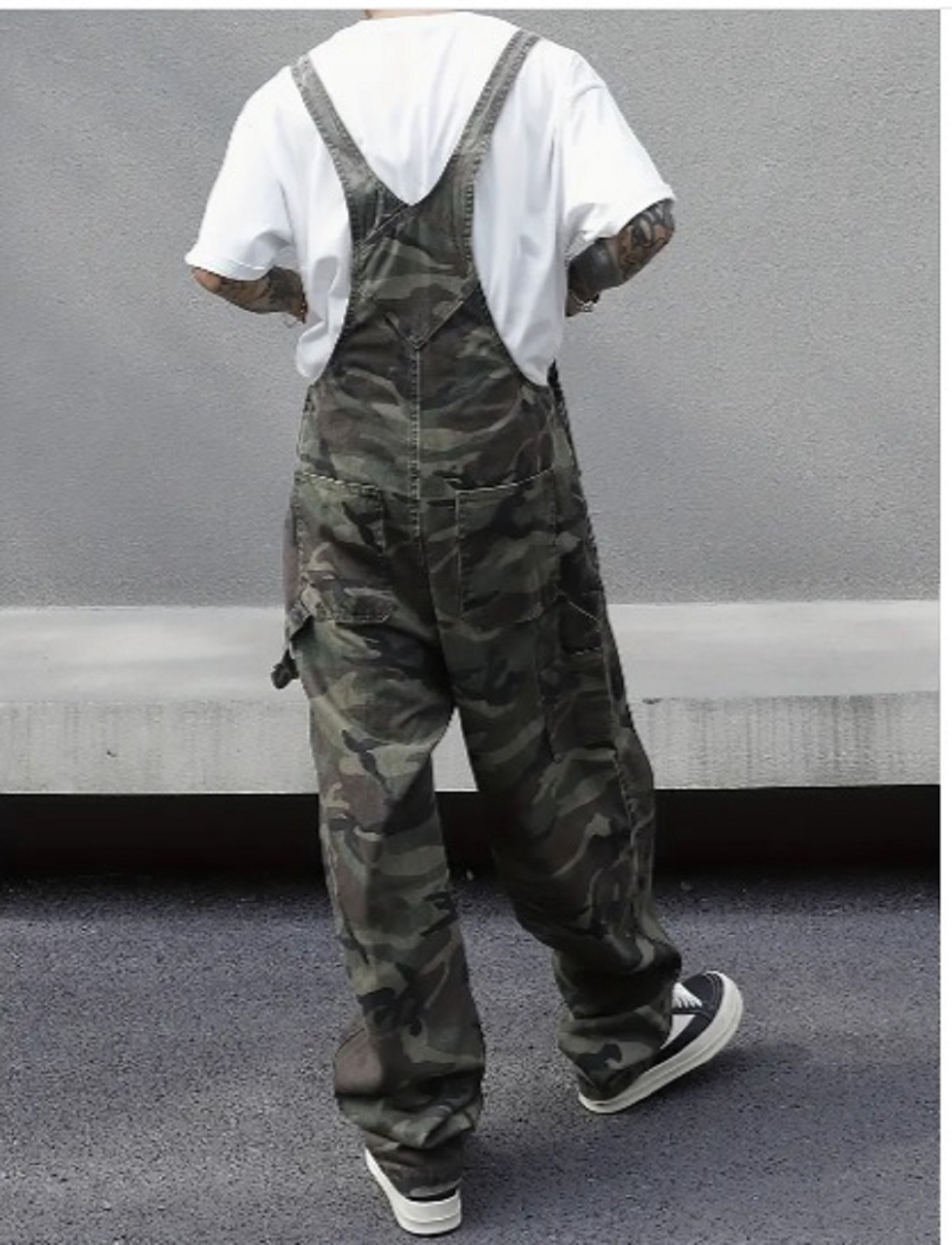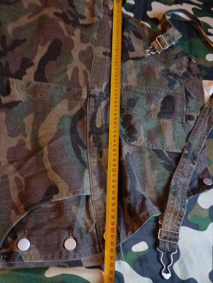 Liela izmēra kamouflāžas džinsu auduma kombinzonbikses, vidukļa apkārtmērs -130cm, garums -107cm, plata kājas stara-26cm.