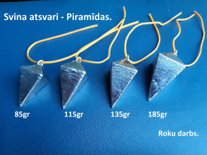 Deviņu savādāku formu un svaru svina atsvari gruntsmakšķerēšanai ,piejamie svari uz foto" Pļentaki''-80;100;120 ;140 ;180;200 gr. Cena +o, 20centi pie svara. Svina atsvari gruntsmakšķerēšanai-' 'Piramīdas''-85;115;1 3 5;18 5gr. Cena+o, 15eur pie svara. Svina atsvars jūrai ''Jūrnieks''-140;160; 180g r. Cena +o, 20eur. pie svara. Svina atsvars jūrai ar ragiem ''Enkurs''-85;100;120 gr. Cena=2eur. gab. Svina atsvars ar ļoti labu noturību jūrā, straumē-''Zvaigzne''- 120; 130;140;150gr. Cena +o, 20eur pie svara. Svina atsvari Big-Olives-40;50;60;7 0;80gr. Cena +5centi pie svara. Svina atsvars ''Bulta''-90;100;120g r. cena +0, 20eur. pie svara. Svina atsvars Cilpa -110;130;150;170gr.Svina atsvars ''Beka''-120;140;160; 180g r. cena +0, 20eur pie svara. (120gr+o, 20=1, 40eur) Iepriekš vienu dienu pasūtot nopirkt var Jelgavā, ja tālāk var nosūtīt. Katram pircējam obligāts bonusiņš.