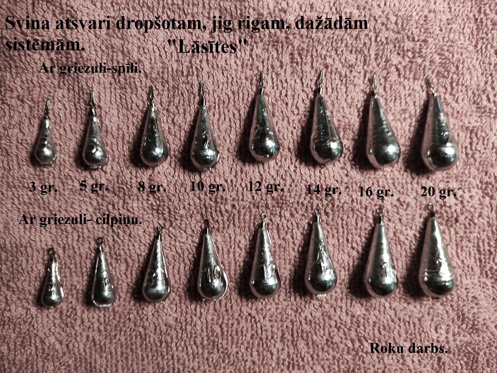 Svins Dropshotam, Jig-Rig, Atvadas sistēmām: pieci modeļi un visādi svari -olivītes , pirkstiņi , banāns, lāsītes, un pear. Olivītes pieejamas svarā no 4-40gr. Pirkstiņi no 2-45gr. Banāns no 5-30gr. Lāsītes 3-20gr. Pear no 4-11gr. Lode no 4-16gr. Cenas -2;4;6;8gr. =o, 30eur, 10;12;15gr. =o, 35eur, 20;25;30gr=o, 40eur, 35;40gr=o, 45eur, 45gr=o, 50eur. gab. Piejamie svari uz foto. Visi svari pieejami gan ar dropshota griezuli, gan parasto cilpiņu. Pilnīgs roku darbs. Pasūtīt vienu dienu iepriekš un nopirkt var Jelgavā var nosūtīt ar kurjerdienestiem pa visu Latviju , katram pircējam patīkams bonusiņš.