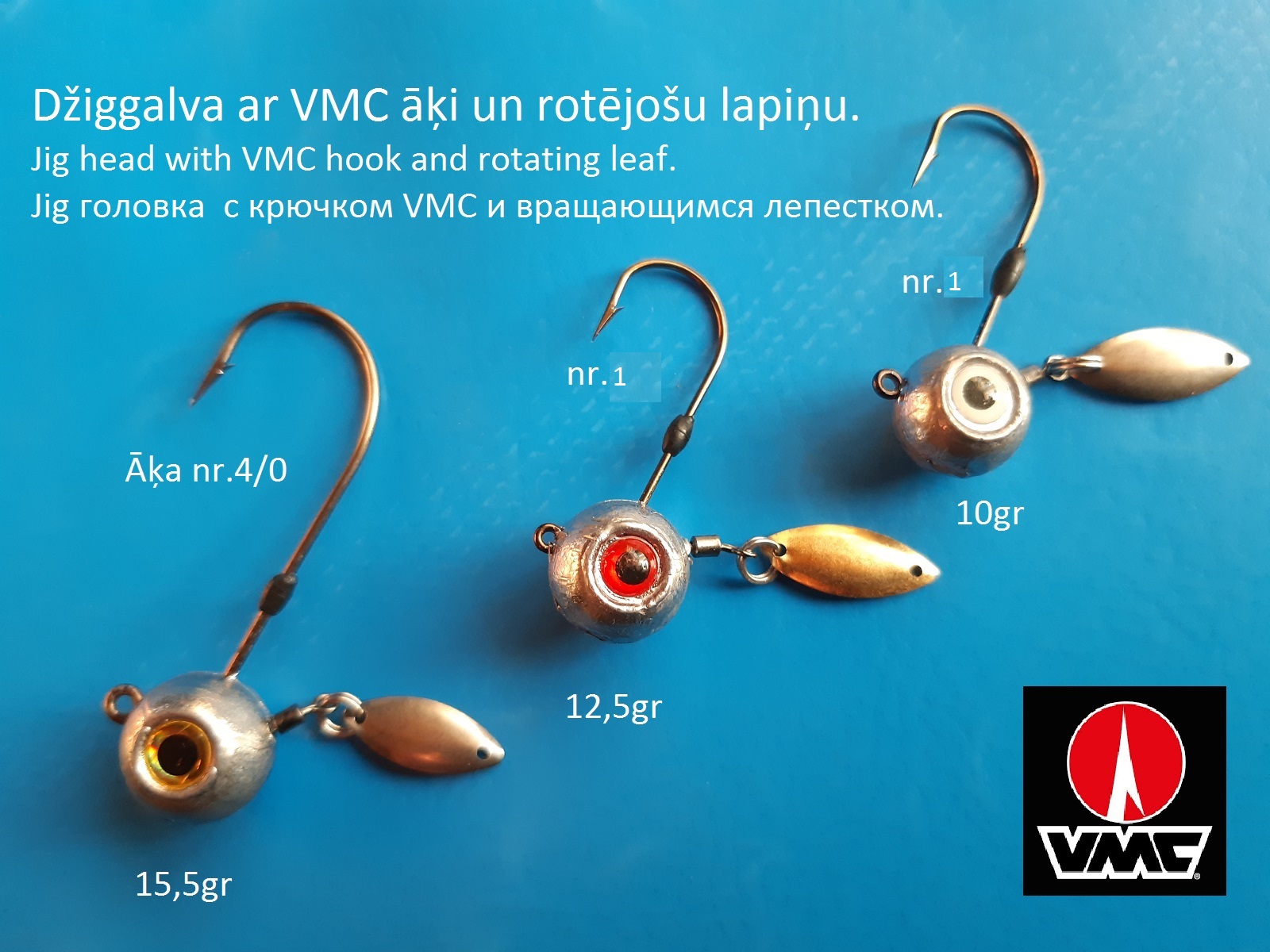 Svina džiggalvas ar Vmc āķi, Nr1;nr4;nr;4/0;nr5/0 actiņu un brīvi rotējošu lapiņu, dzeltenu vai baltu pēc izvēles. Piejamie svari 6, 5gr;9, 5gr;12, 5 gr;15, 5 gr. Cena o, 60eur. gab. Vienu dienu iepriekš pasūtot nopirkt var Jelgavā. Var nosūtīt.