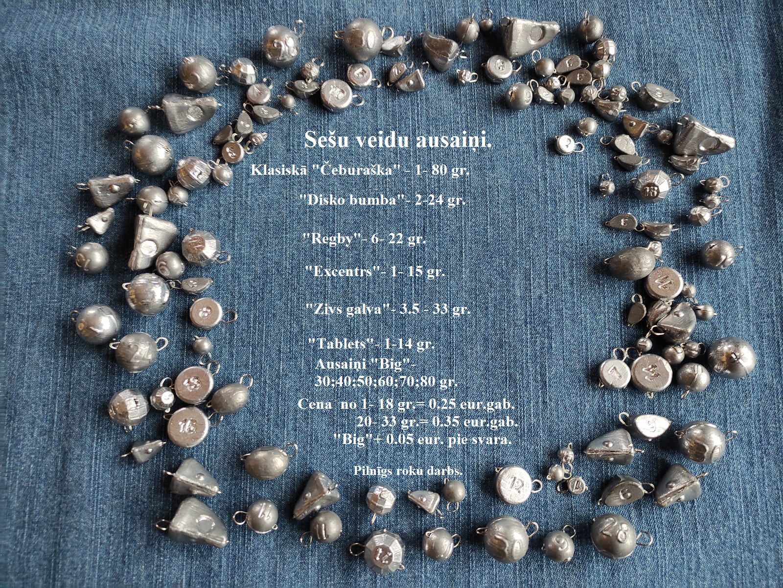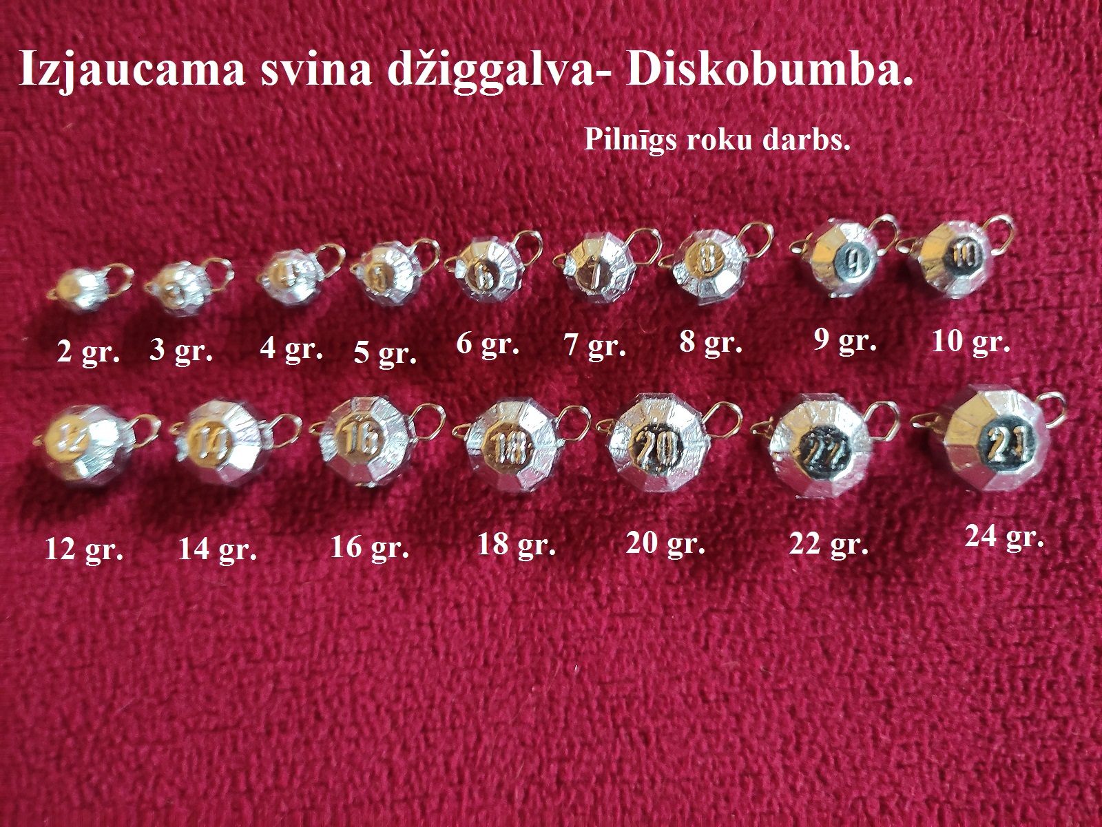Klasiskie apaļie ausaiņi,un diskobumba.Cena 1-18gr=o,25eur.gab. 20-30gr=o,35eur.gab.Lielajiem +5centi pie svara(50gr.+5=55centi) Pieejamie svari uz foto.Dienu iepriekš pasūtot nopirkt var Jelgavā,var nosūtīt ar kurjerdienestu...
