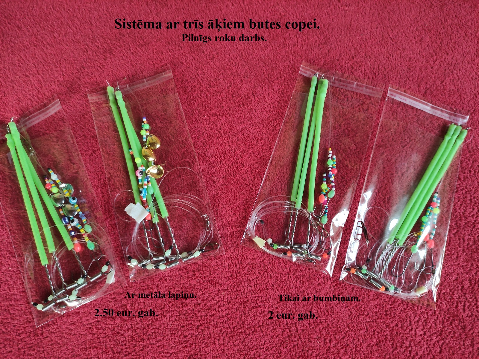 Sistēmas ar trīs āķiem butes copei jurā, ar luminiscējošām , uv, stikla un pvc bumbiņām. Cena 2eur. gab. Ar bumbiņām un dažādu krāsu metāla rotējošām lapiņām cena 2, 50.eur. gab. Sistēmas pamataukla Daiwa Justron 8, 0=0, 50mm. pavadas arī Daiwa Justron 2, 0=0, 235mm. Āķi Kosadaka N2;N4.Distancers-150m m. Var piemeklēt arī dažādu modeļu un dažādu svaru svina atsvarus. Var nosūtīt ar kurjerdienestu pa visu Latviju.