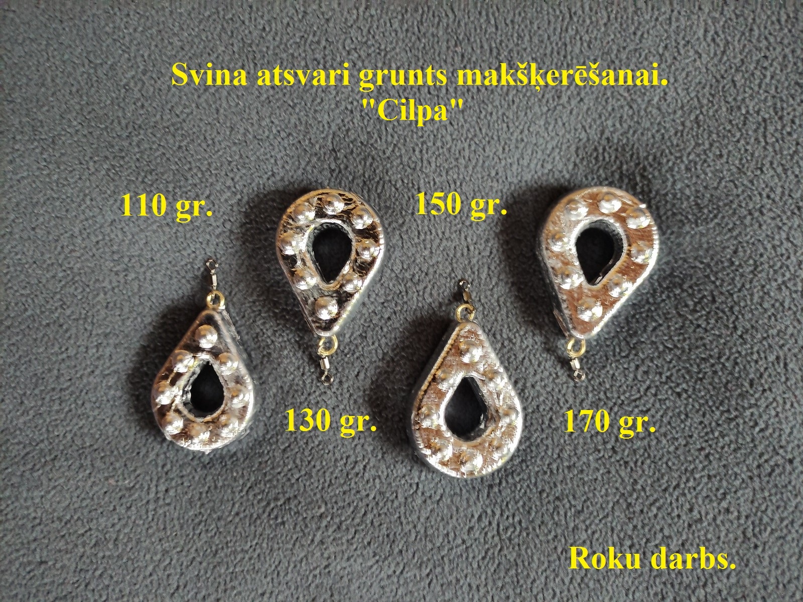 Deviņu savādāku formu un svaru svina atsvari gruntsmakšķerēšanai ,piejamie svari uz foto" Pļentaki''-80;100;120 ;140 ;180;200 gr. Cena +o, 20centi pie svara. Svina atsvari gruntsmakšķerēšanai-' 'Piramīdas''-85;115;1 3 5;18 5gr. Cena+o, 15eur pie svara. Svina atsvars jūrai ''Jūrnieks''-140;160; 180g r. Cena +o, 20eur. pie svara. Svina atsvars jūrai ar ragiem ''Enkurs''-85;100;120 gr. Cena=2eur. gab. Svina atsvars ar ļoti labu noturību jūrā, straumē-''Zvaigzne''- 120; 130;140;150gr. Cena +o, 20eur pie svara. Svina atsvari Big-Olives-40;50;60;7 0;80gr. Cena +5centi pie svara. Svina atsvars ''Bulta''-90;100;120g r. cena +0, 20eur. pie svara. Svina atsvars Cilpa -110;130;150;170gr.Svina atsvars ''Beka''-120;140;160; 180g r. cena +0, 20eur pie svara. (120gr+o, 20=1, 40eur) Iepriekš vienu dienu pasūtot nopirkt var Jelgavā, ja tālāk var nosūtīt. Katram pircējam obligāts bonusiņš.