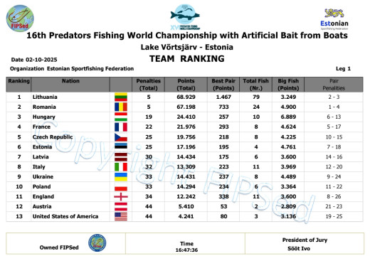 Tas kopvērtējumā ierindo Latviju 7. vietā starp 13 pārstāvētām izlasēm, kas nu nemaz neatbilst mūsējo plāniem un ambīcijām. Jo īpaši, ja atceramies pirms gada Īrijā izcīnītās medaļas. Vadībā pērnā gada čempioni Lietuvas izlase, Rumānija otrā ar tikpat punktiem, trešā Ungārija.