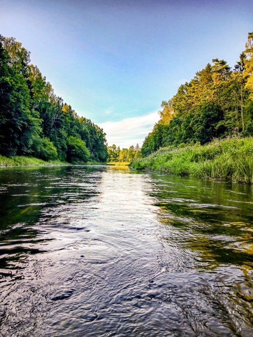 Raitā solī uz mašīnu, un atpakaļ uz upes lejteci. Noskatu vēl zemāku, bet nedaudz straujāku posmu. Saule lēnām sāk glāstīt koku galotnes, un debesis krāsojas oranžā tonī. Īstais laiks, kad būt upē!