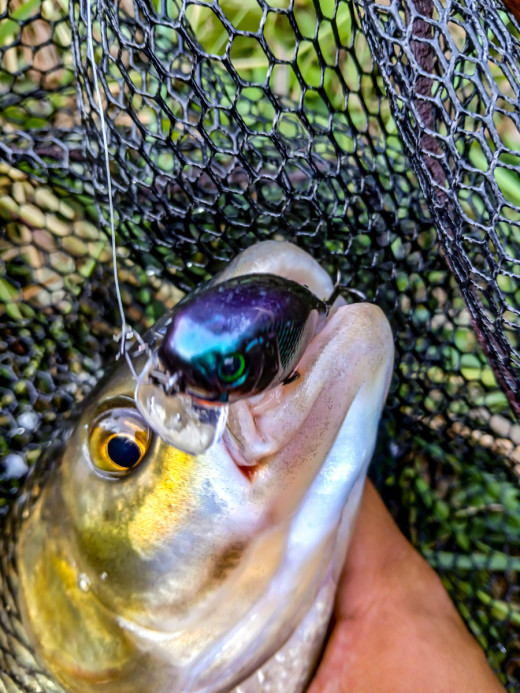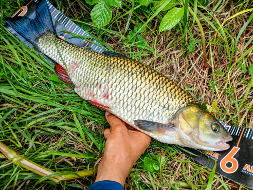 Paņemu Jackall Chubby – sākšu ķemmēt upi. Ūdens viegli duļķains, un zāļu daudz, bet atrodu brīvu vietu un metu iekšā. Mazo sapalu copes ilgi nav jāgaida, bet ne pēc tiem šurp esmu braucis. Drīz vien seko arī labāks ņēmiens, un ir – pirmais piecdesmitnieks pieparkots tīkliņā. Ar to arī maisam gals vaļā.