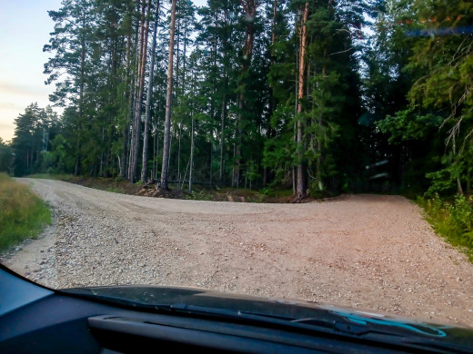 Sameklēju kartē nākamo vietu, kur nolemju palikt pa nakti. Ceļa izvēlei ir vairākas opcijas: pa labi jeb pa taisno vai pa kreisi jeb ar palielu līkumu. Lai iet ātrāk – rauju pa labi. Pamazām ceļš pārtop meža celiņā, bet tad kļūst aizvien šaurāks un šaurāks, parādās bedres, un beigās tas kļūst pavisam neizbraucams. Kā parasti – taisnākais ceļš izrādās garākais.